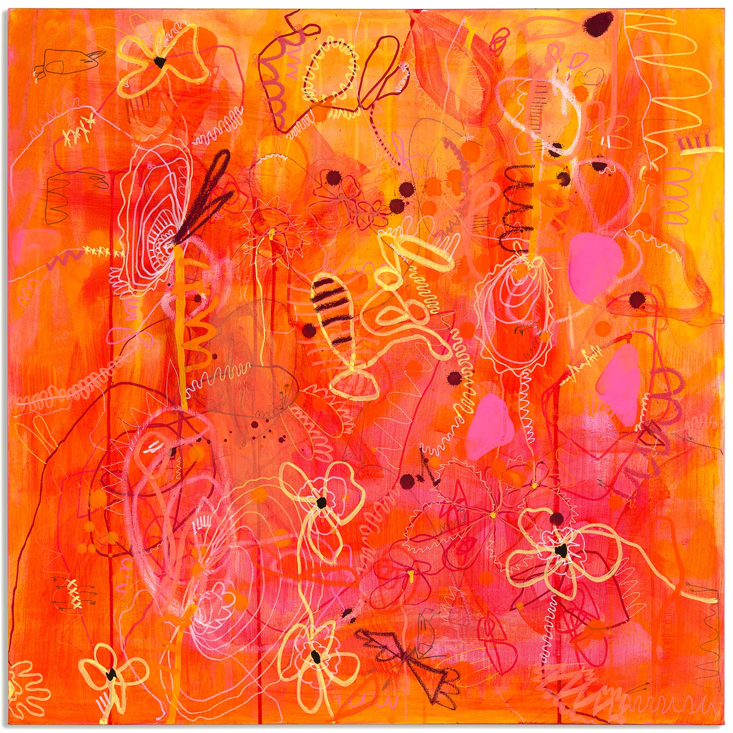 This one buzzes. Like summer heat and scraped knees and the thrill of being outside way past dinner. The pinks and oranges are loud on purpose—like that little girl who never asked for permission to take up space. I painted this thinking about getting lost in the clover fields, face down in the grass, chasing four-leaf clovers but getting distracted by every single petal. That version of me? She never left. She just needed a way back in.